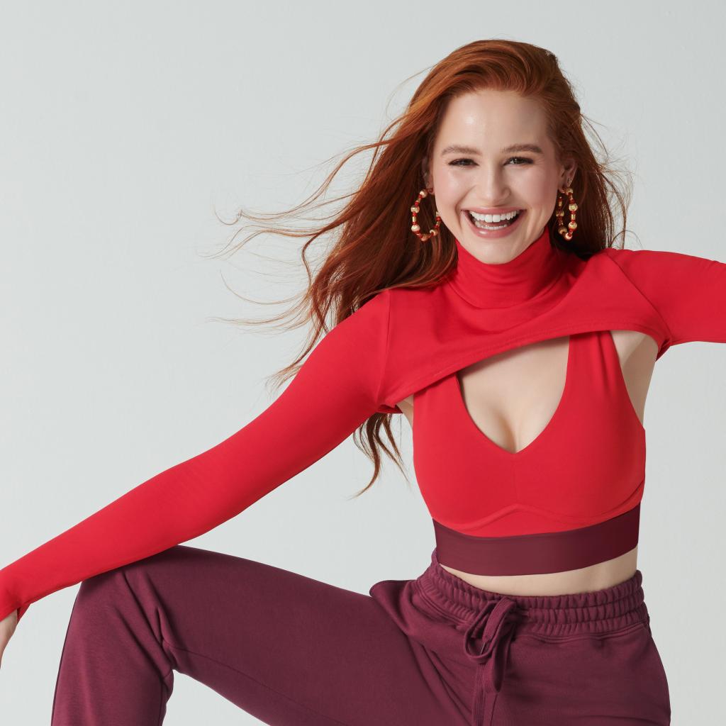 Wallpaper Smiling actress Madeline Petsch in a red outfit
