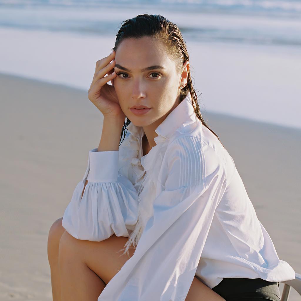 Wallpaper Actress Gal Gadot in a white shirt sits on the sand