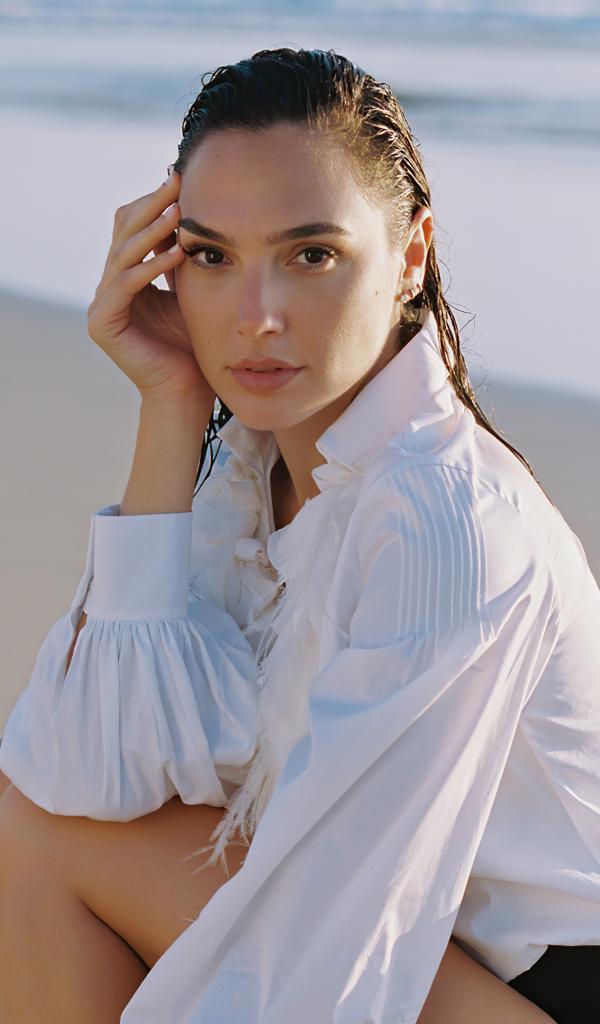 Wallpaper Actress Gal Gadot in a white shirt sits on the sand
