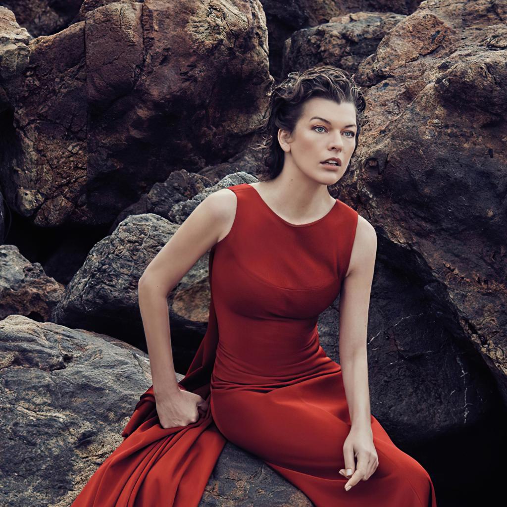 Wallpaper Actress Milla Jovovich in a red dress sits on a stone
