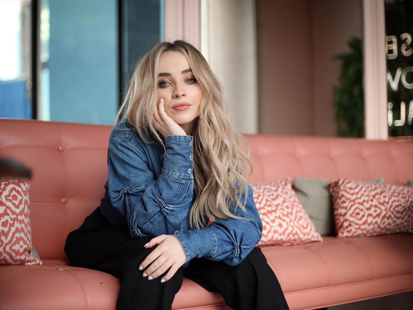 Wallpaper Actress Sabrina Carpenter sits on the sofa in the room