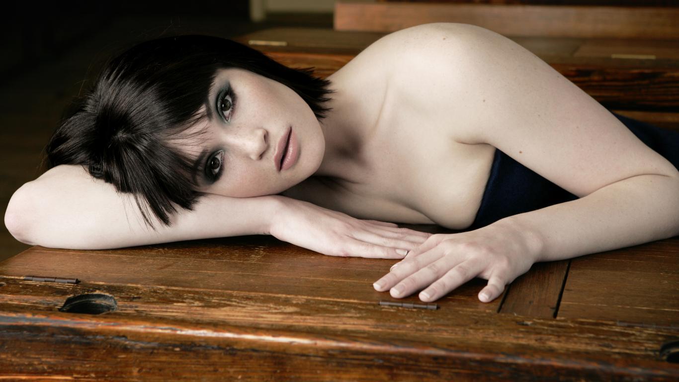 Wallpaper Actress Gemma Arterton lies on a wooden table