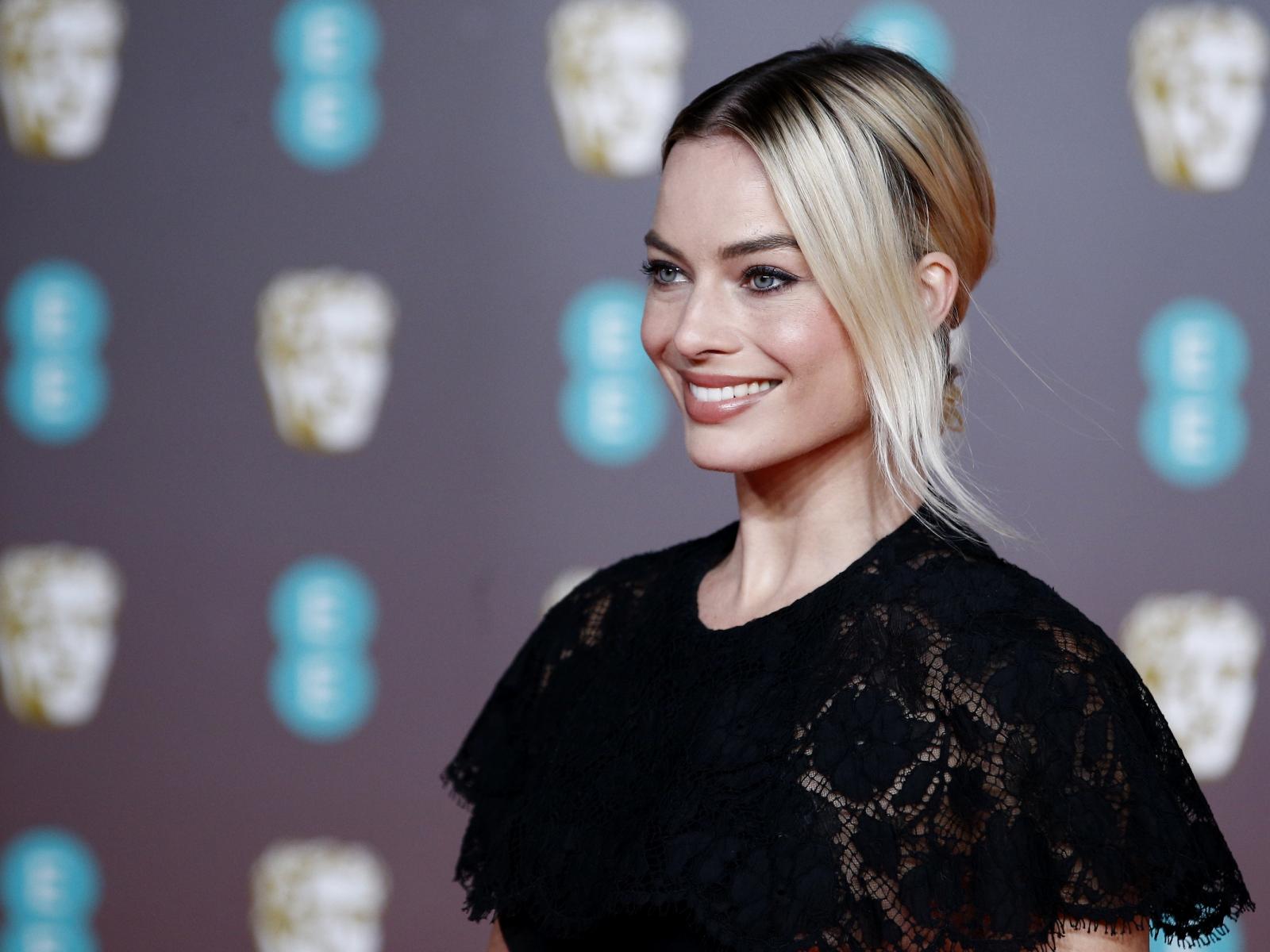 Wallpaper Smiling actress Margot Robbie in black dress