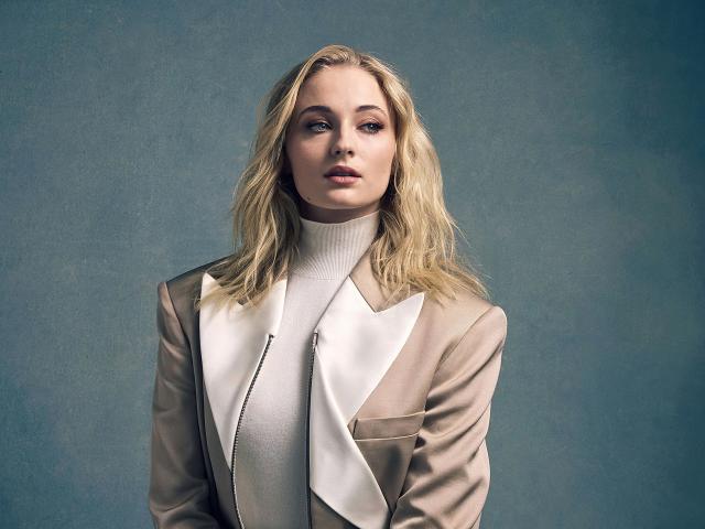 Wallpaper Actress Sophie Turner in a beige suit on a gray background