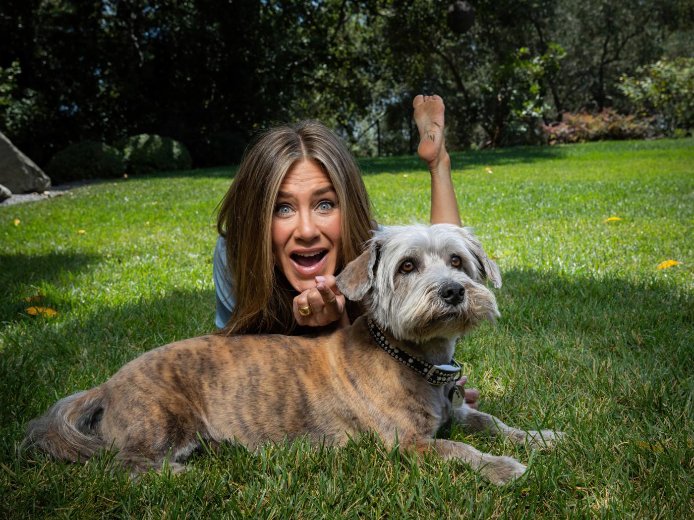 Wallpaper Actress Jennifer Aniston with a dog lying on the grass
