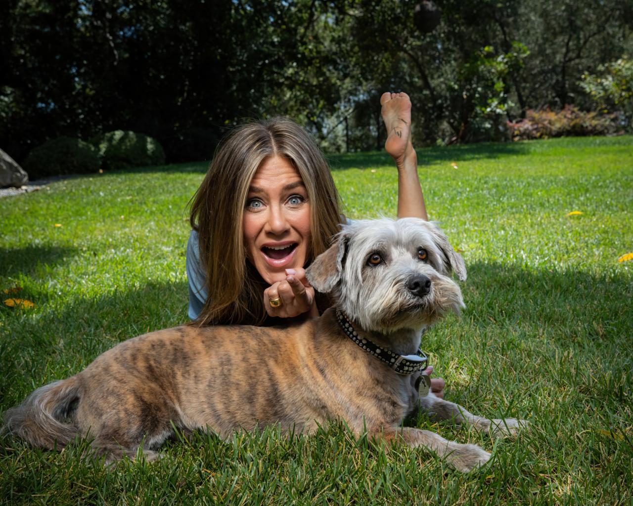 Wallpaper Actress Jennifer Aniston with a dog lying on the grass