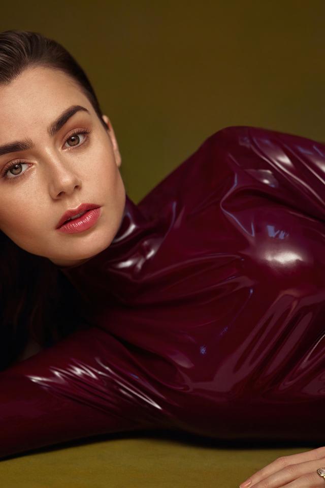 Wallpaper Beautiful girl, actress Lily Collins in a leather suit