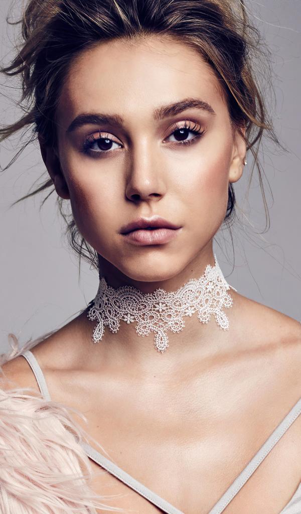 Wallpaper Actress Alexis Ren in a pink outfit on a gray background