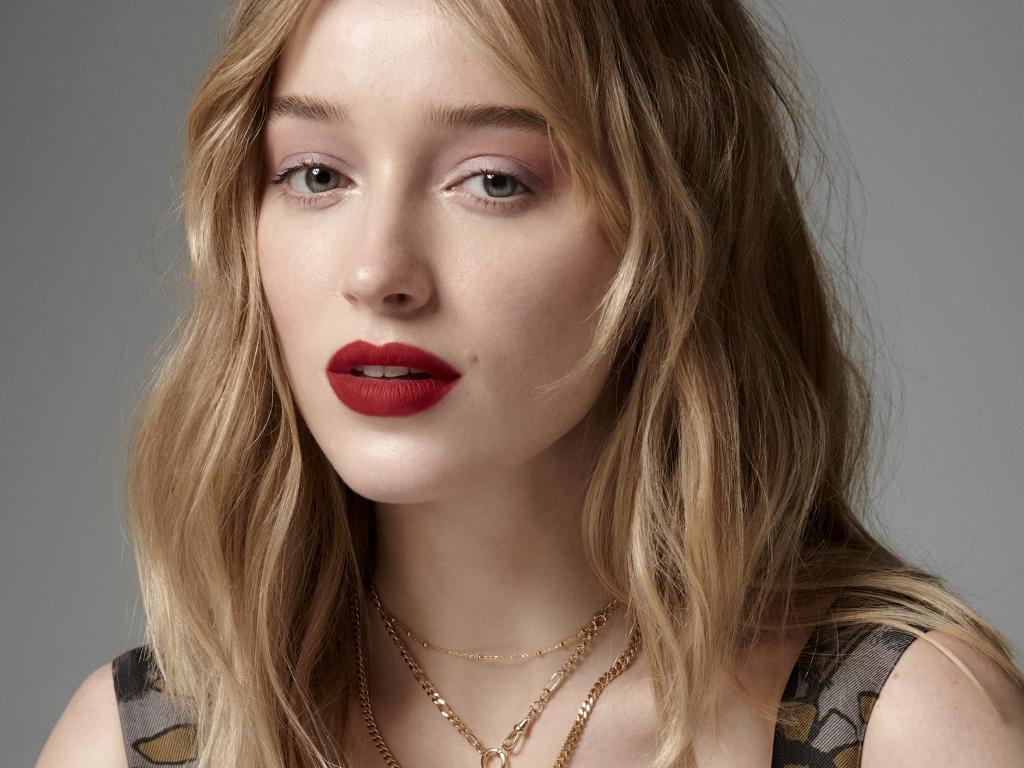Wallpaper Bright lipstick on the lips of actress Phoebe Dinevor on a gray background