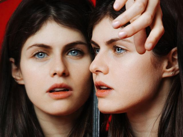 Wallpaper Young beautiful blue-eyed actress Alexandra Daddario on a red background