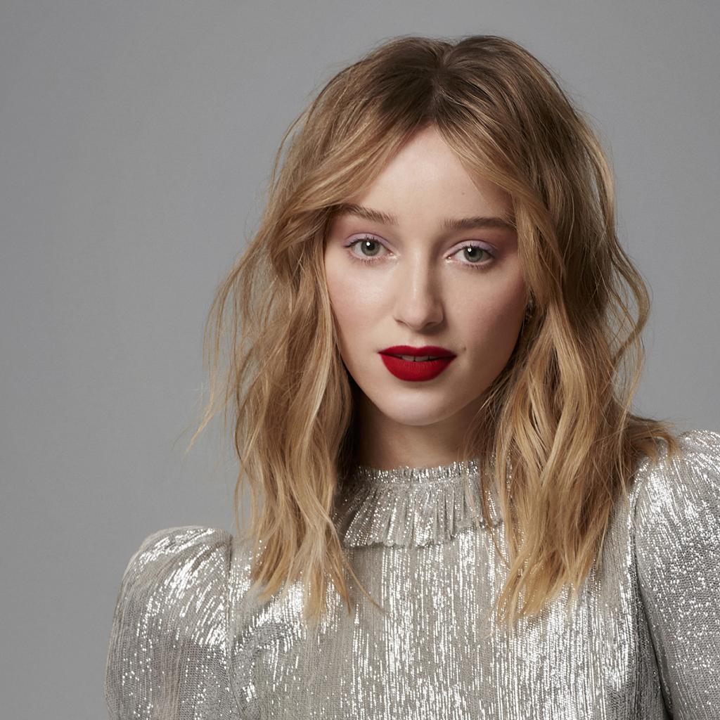 Wallpaper Beautiful girl actress Phoebe Dinevor on a gray background in a shiny dress