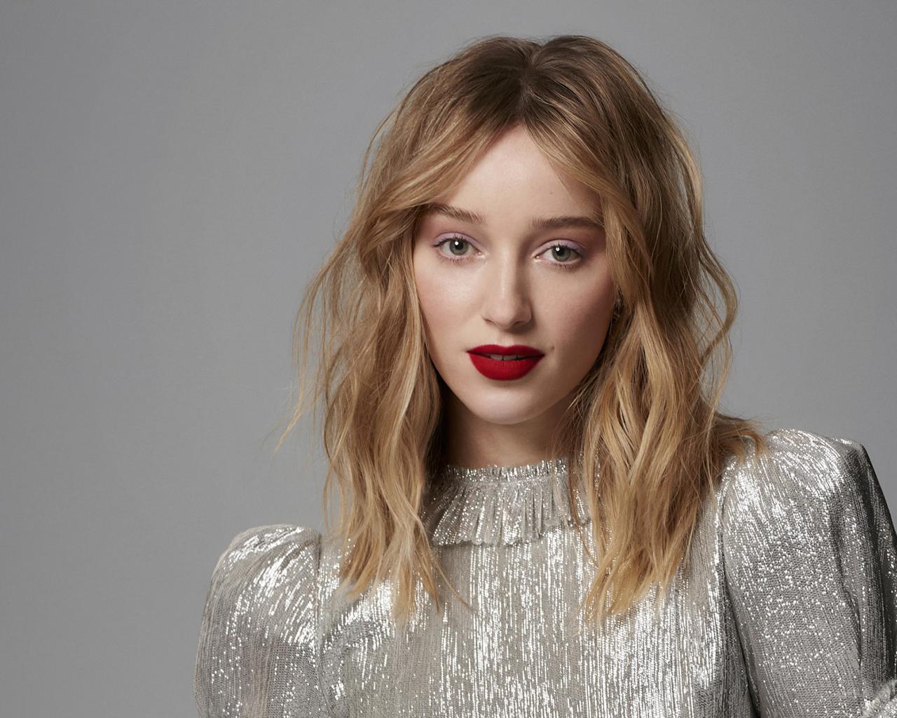 Wallpaper Beautiful girl actress Phoebe Dinevor on a gray background in a shiny dress