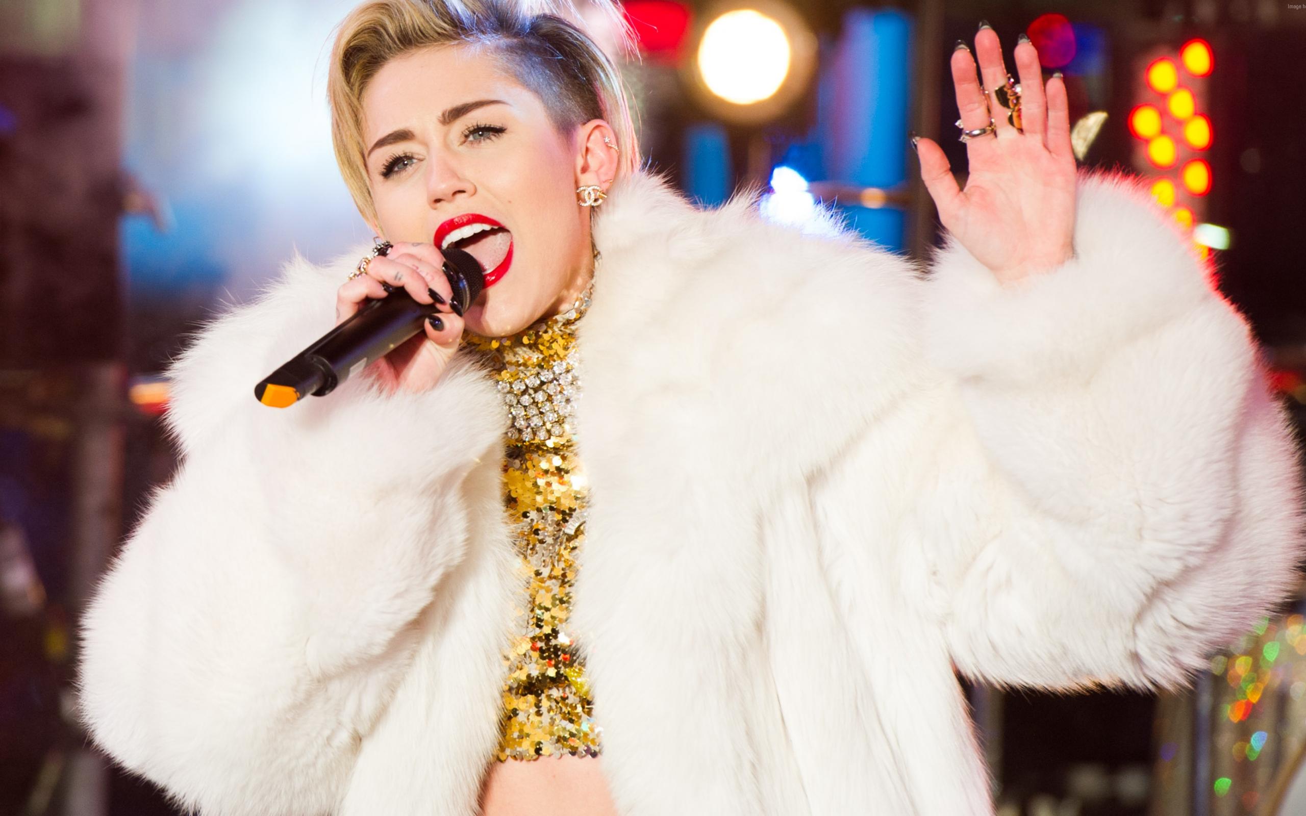 Wallpaper Popular young singer Miley Cyrus in a white fur coat on stage