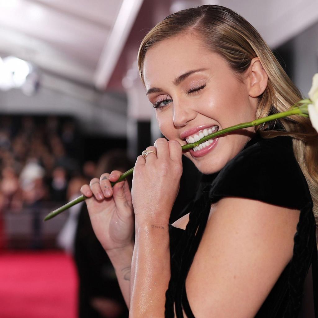 Wallpaper Singer Miley Cyrus with a rose in her teeth