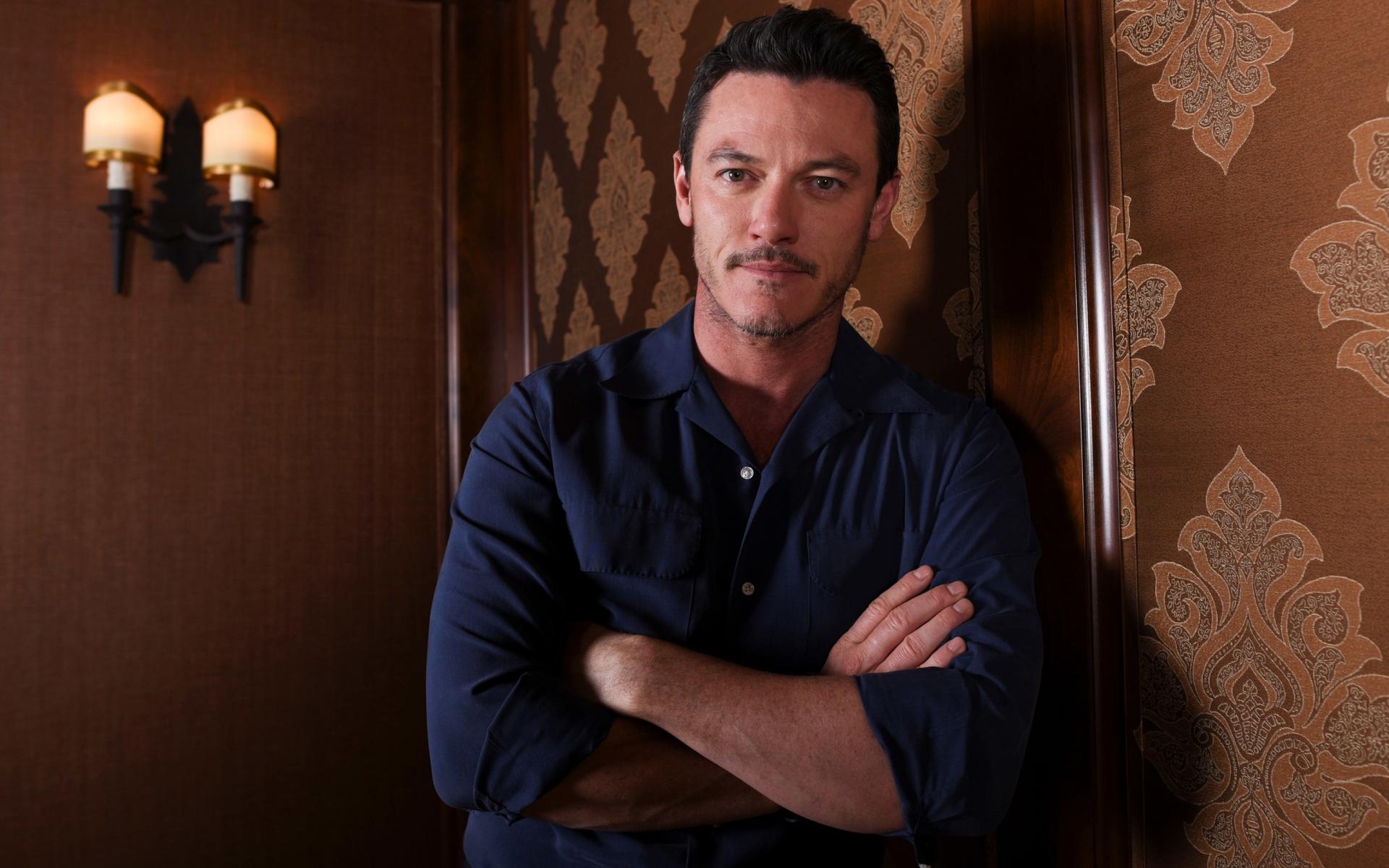 Wallpaper Actor Luke Evans in shirt stands against the wall
