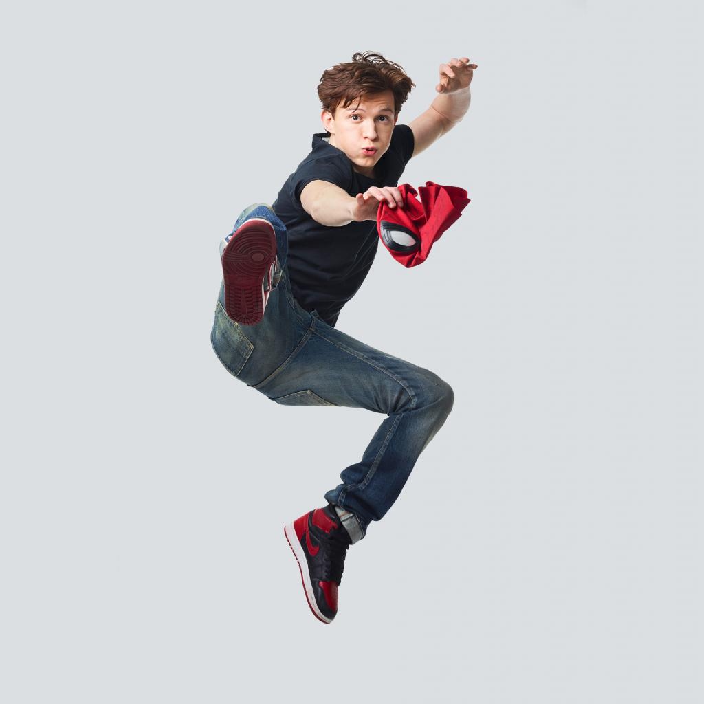 Wallpaper Young actor Tom Holland in a jump on a gray background