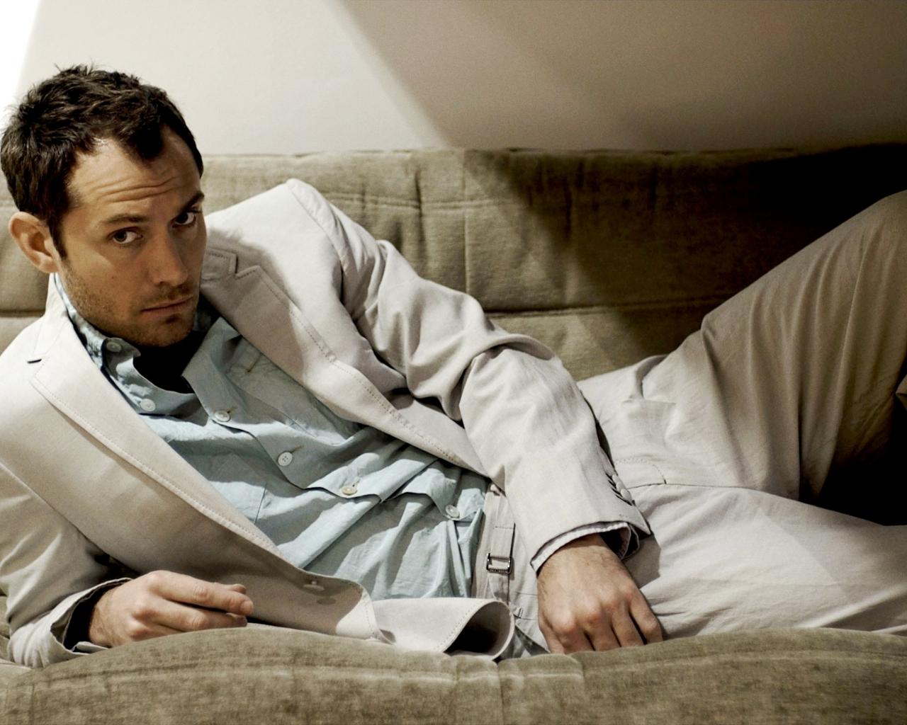 Wallpaper British actor Jude Law in a suit lies on a sofa