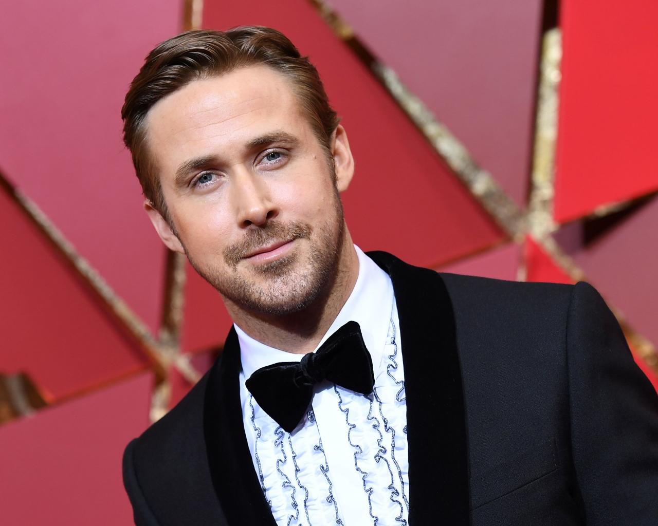 Wallpaper Actor Ryan Gosling in a suit on a red background