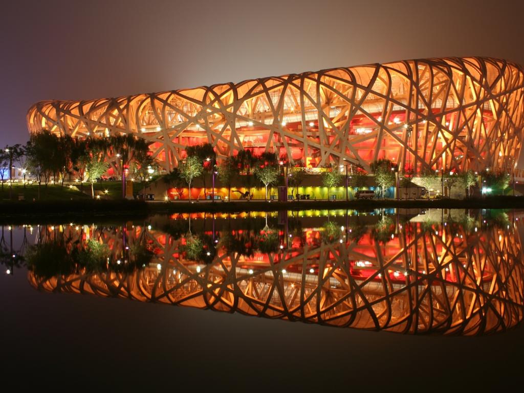 Wallpaper Beijing National Stadium is reflected in the water, PRC