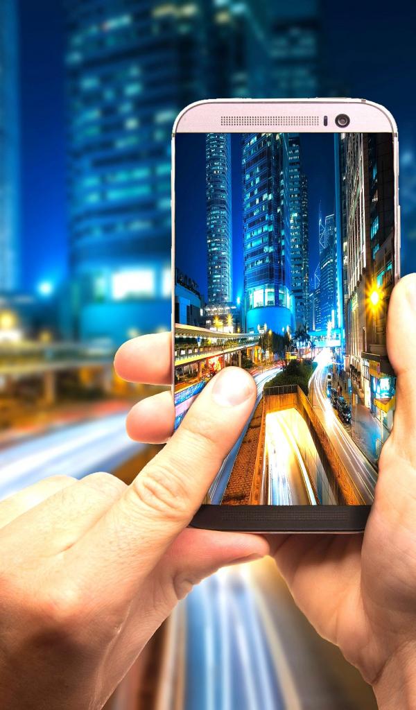 Wallpaper A man makes a photo of the night city on a smartphone