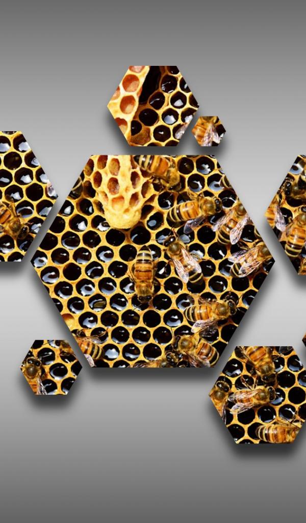 Wallpaper The hexagonal honeycomb with bees on a gray background