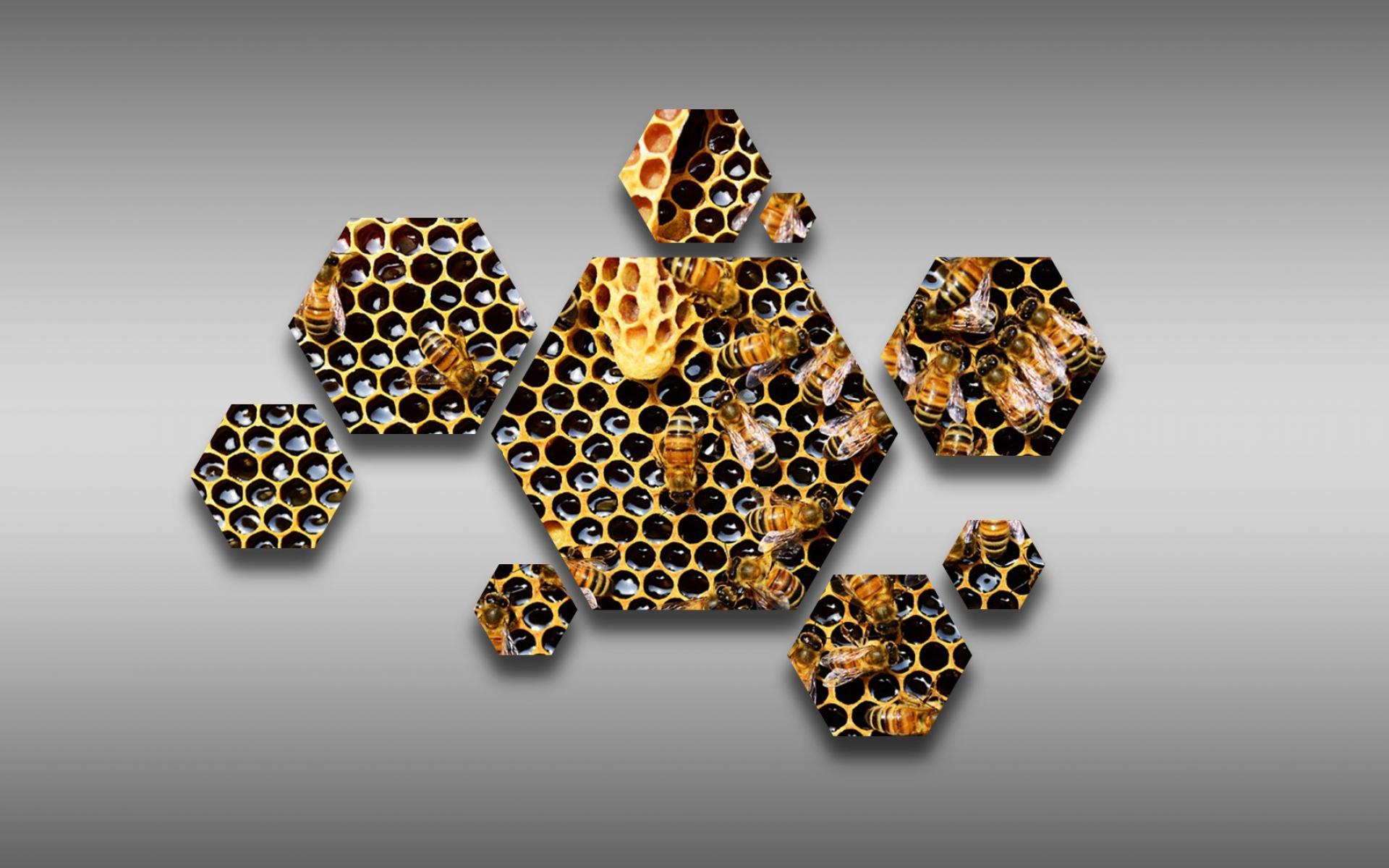 Wallpaper The hexagonal honeycomb with bees on a gray background
