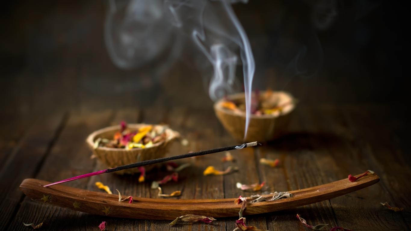 Wallpaper Aromatic stick on a table with dry petals of flowers
