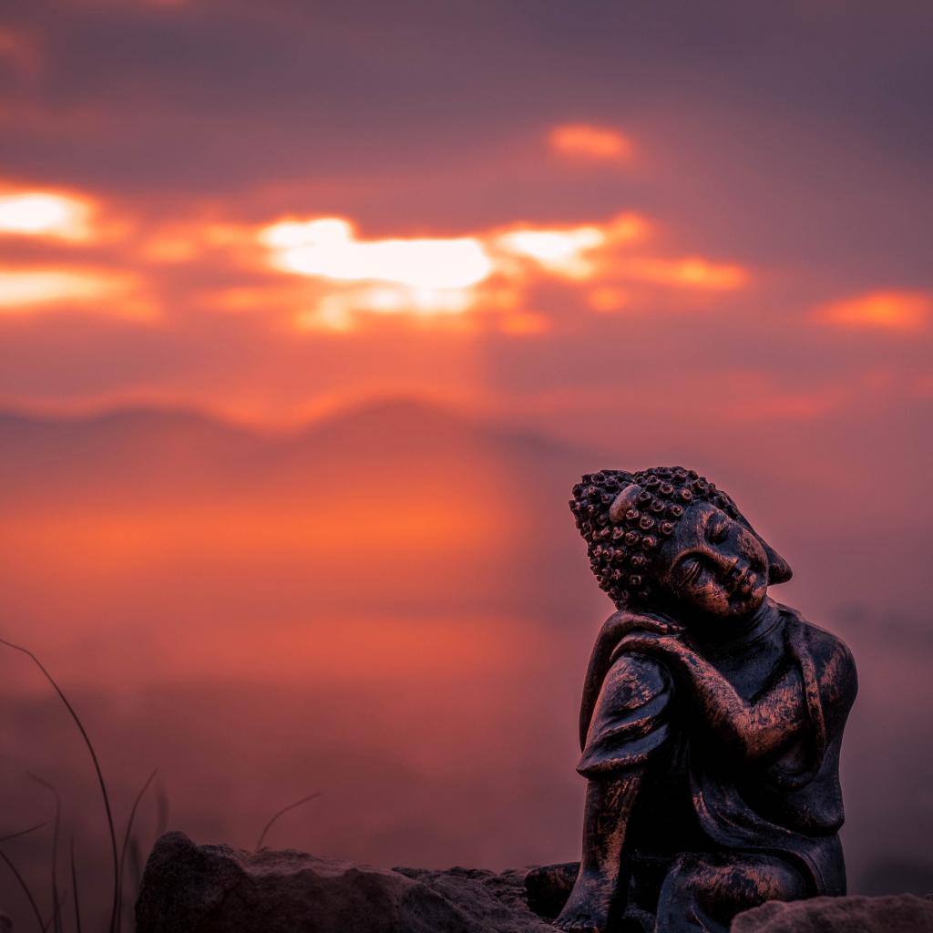 Wallpaper Buddha statue against the sun at sunset