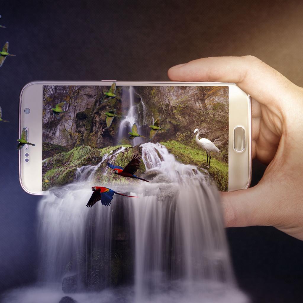Wallpaper Waterfall pours out of the smartphone in the hands