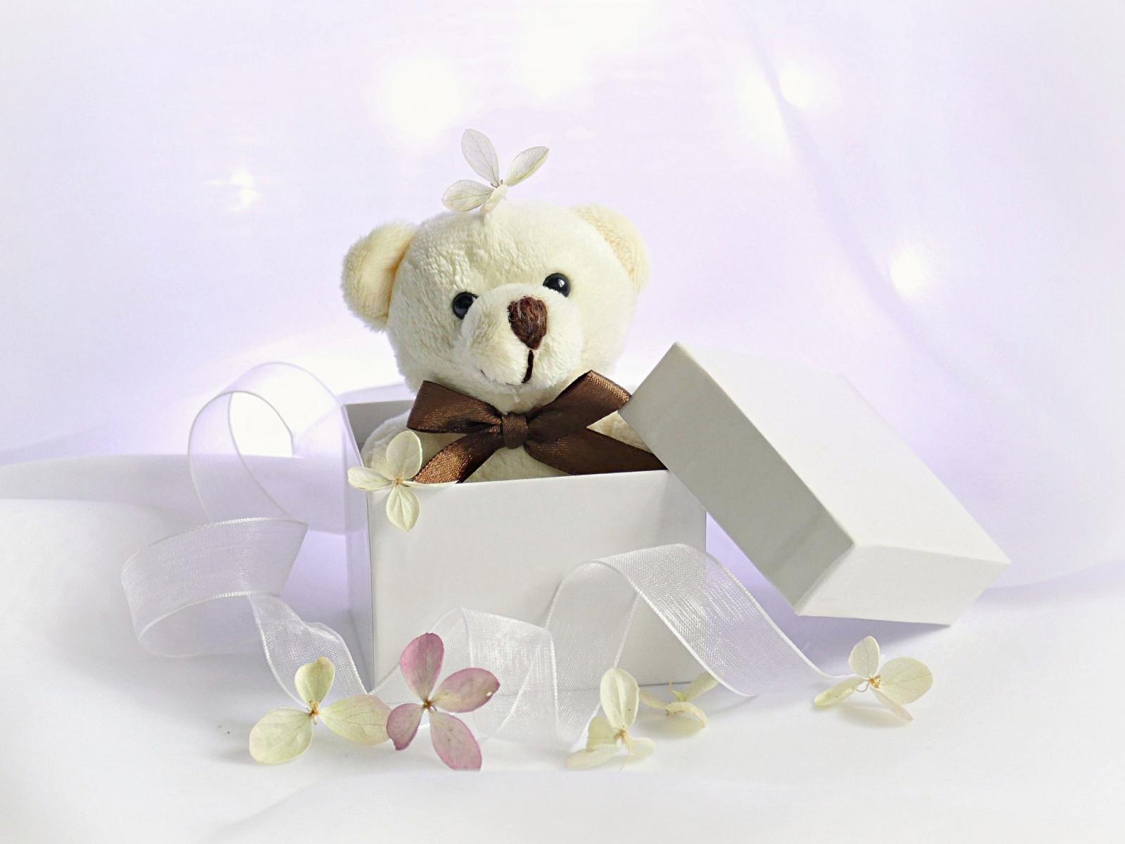 » Wallpaper White teddy bear in a gift box