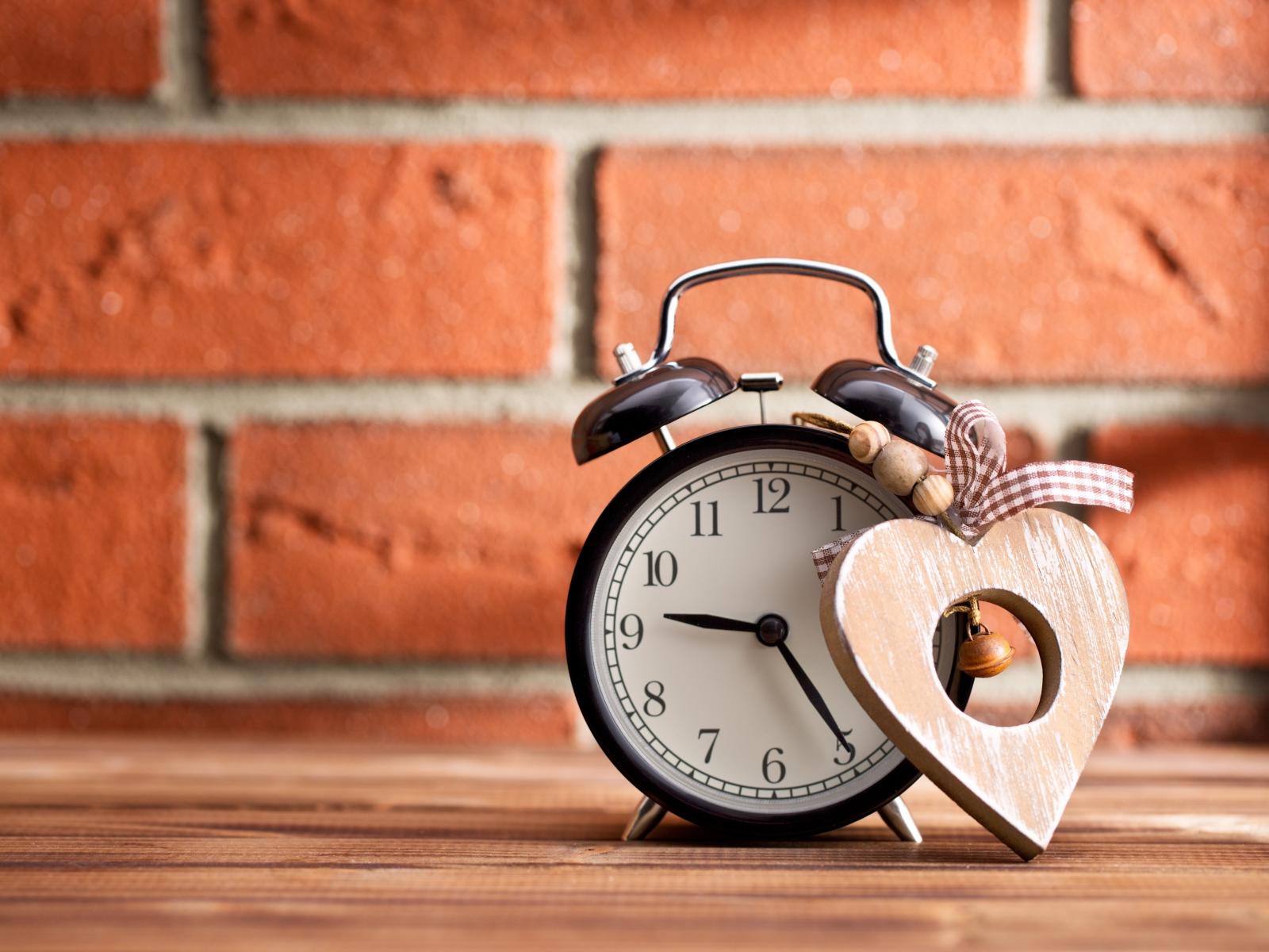 Wallpaper Alarm clock with a wooden heart stands on a wall background