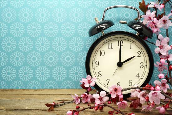 Wallpaper Black alarm clock on a blue background with apricot flowers