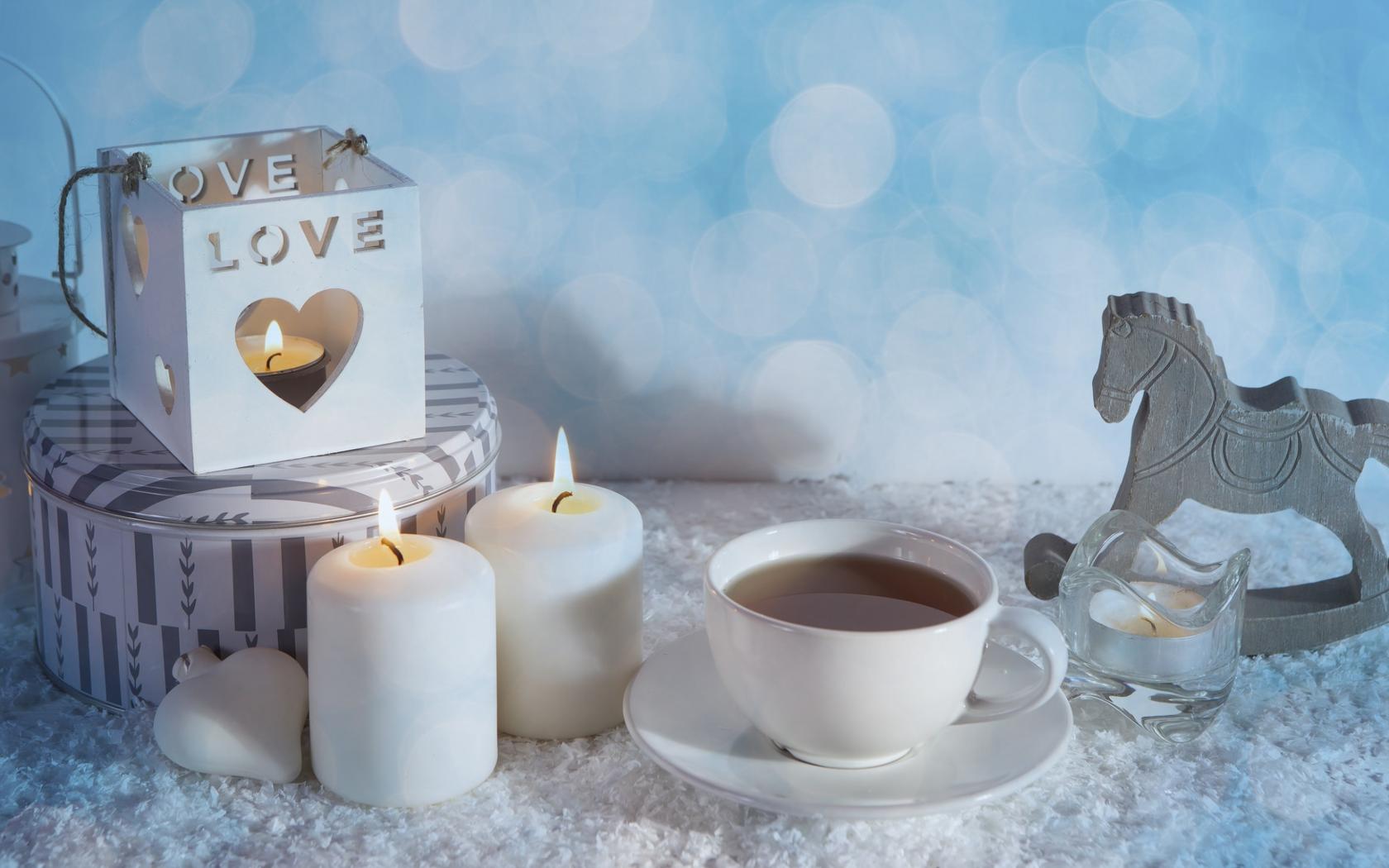 Wallpaper Candles, a cup of tea and the figure of a horse on a table