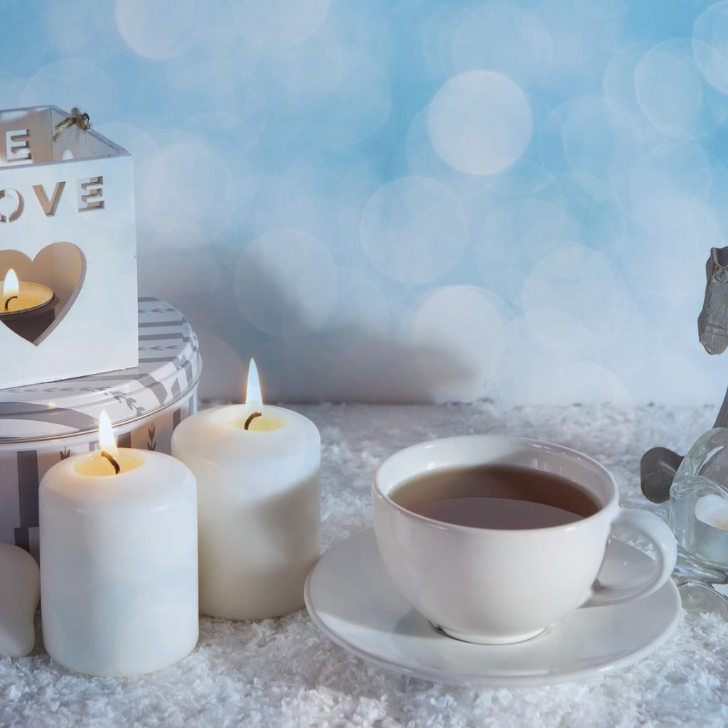 Wallpaper Candles, a cup of tea and the figure of a horse on a table