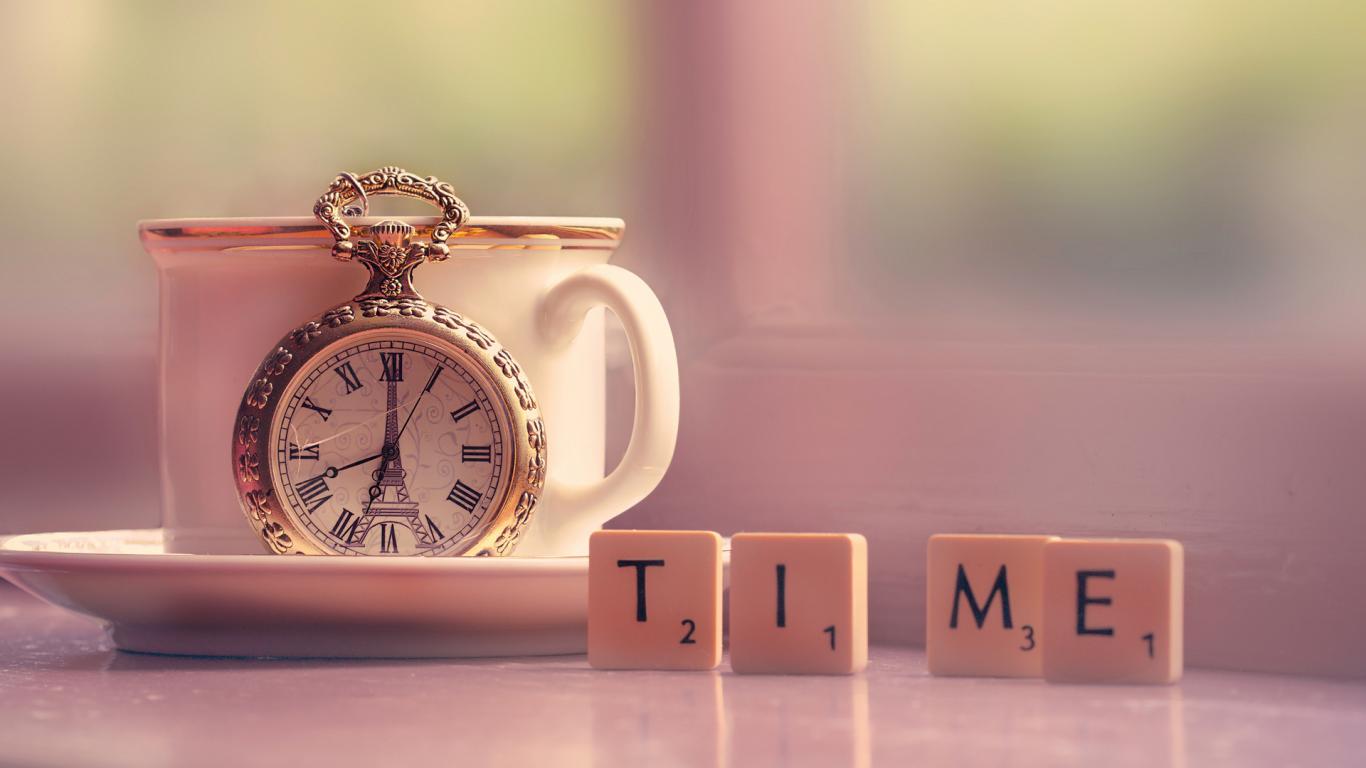 Wallpaper Clock with a cup on a table with dices