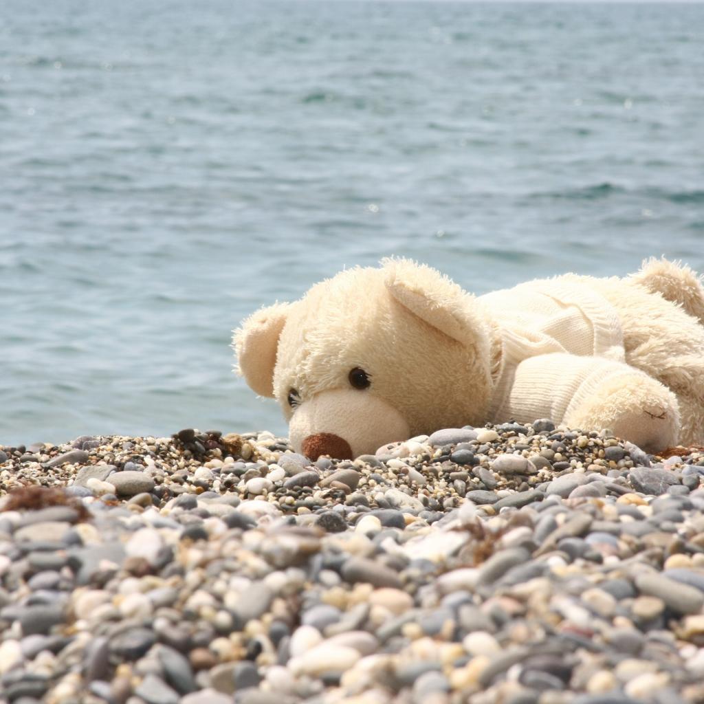 Wallpaper A white teddy bear lies on a pebble by the sea