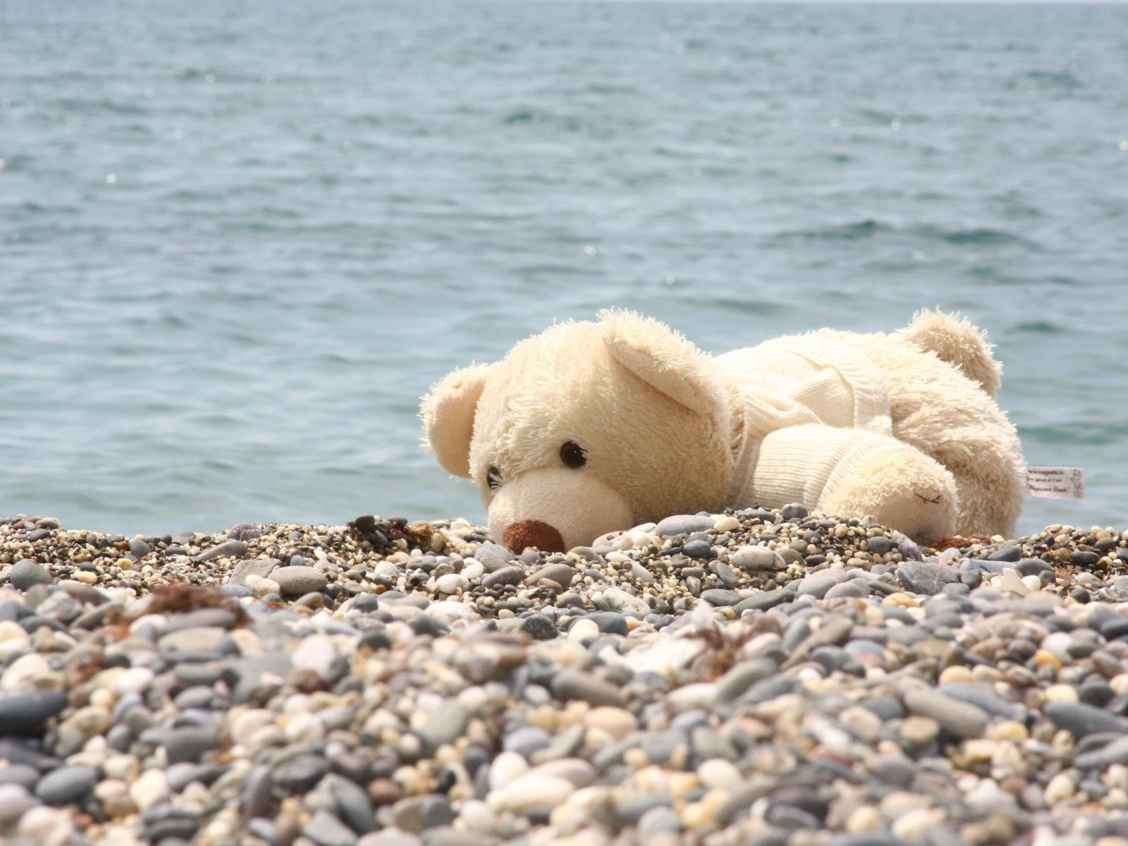 Wallpaper A white teddy bear lies on a pebble by the sea