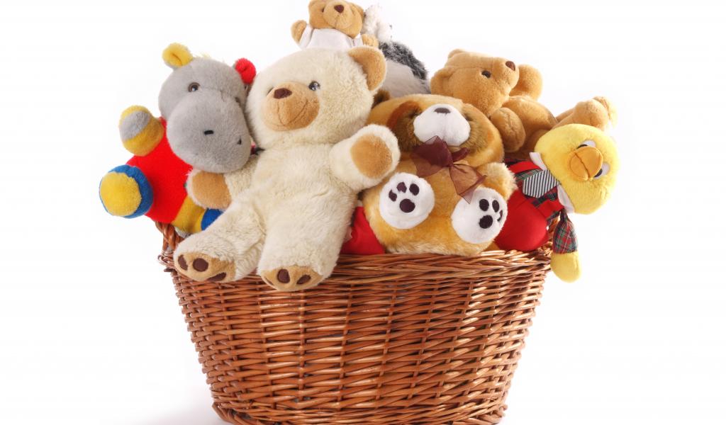 Wallpaper Stuffed toys in a basket on a white background