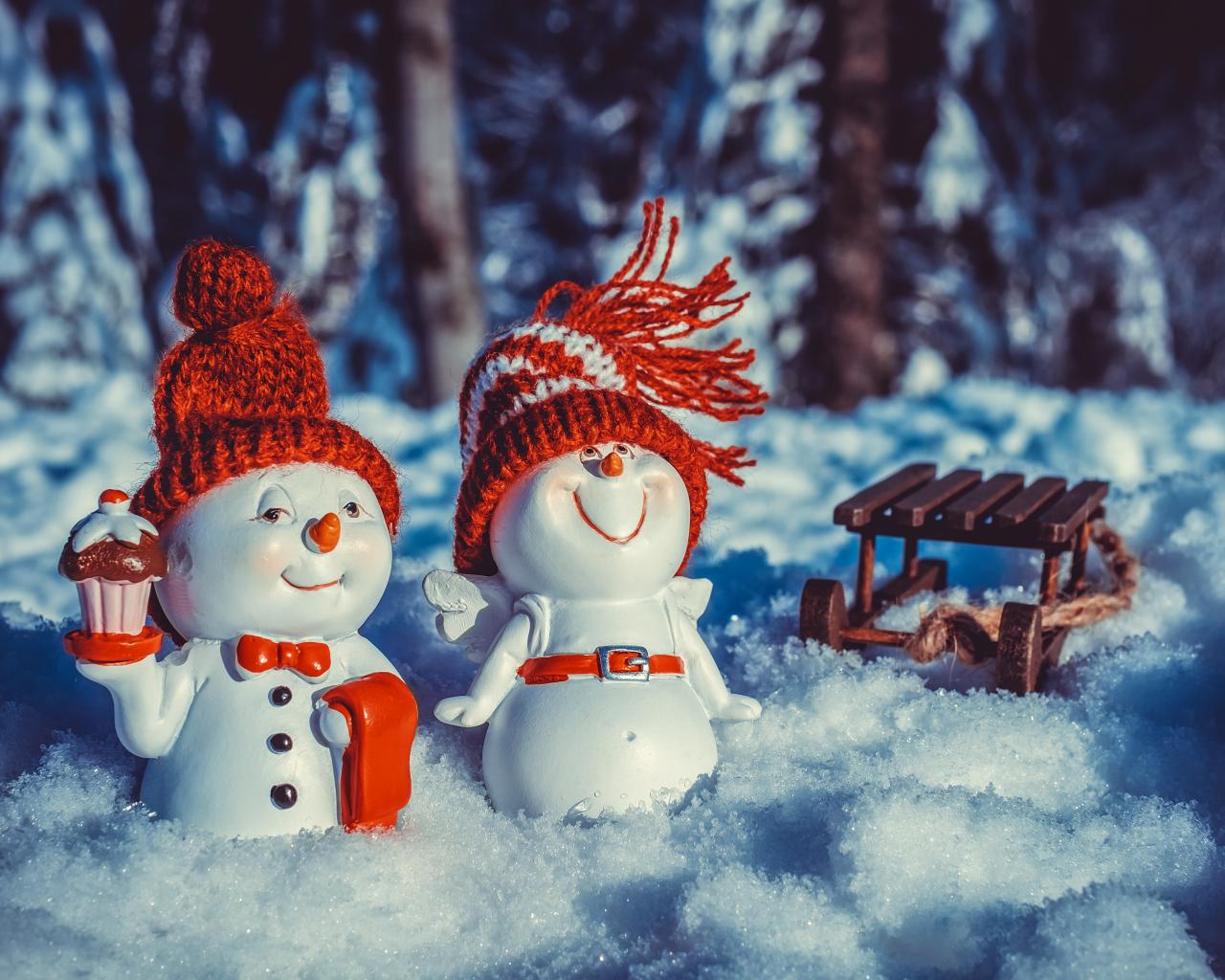 Wallpaper Three snowmen in the snow near an artificial Christmas tree for New Year