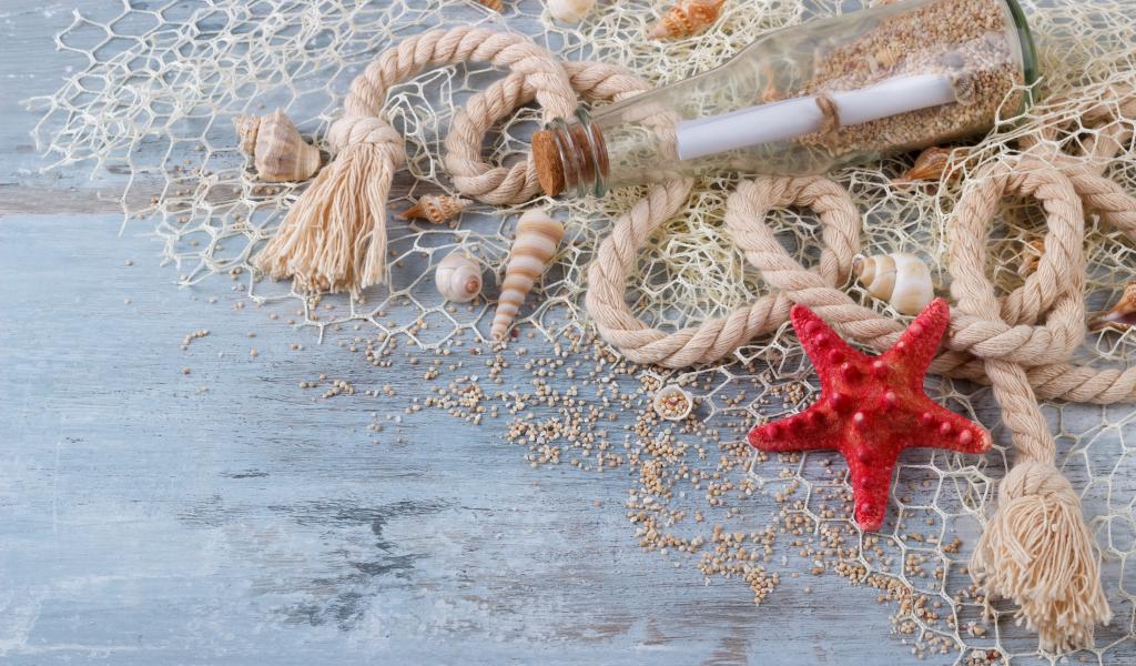 Wallpaper Bottle with a note, shells, mesh, rope and red starfish