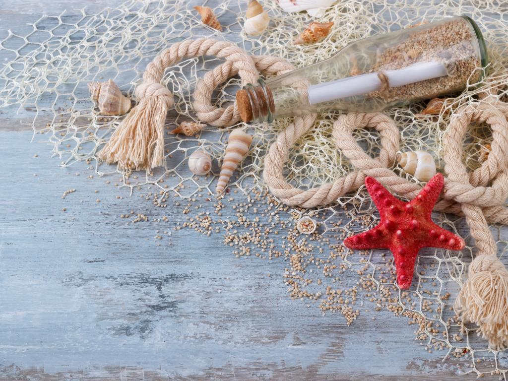 Wallpaper Bottle with a note, shells, mesh, rope and red starfish