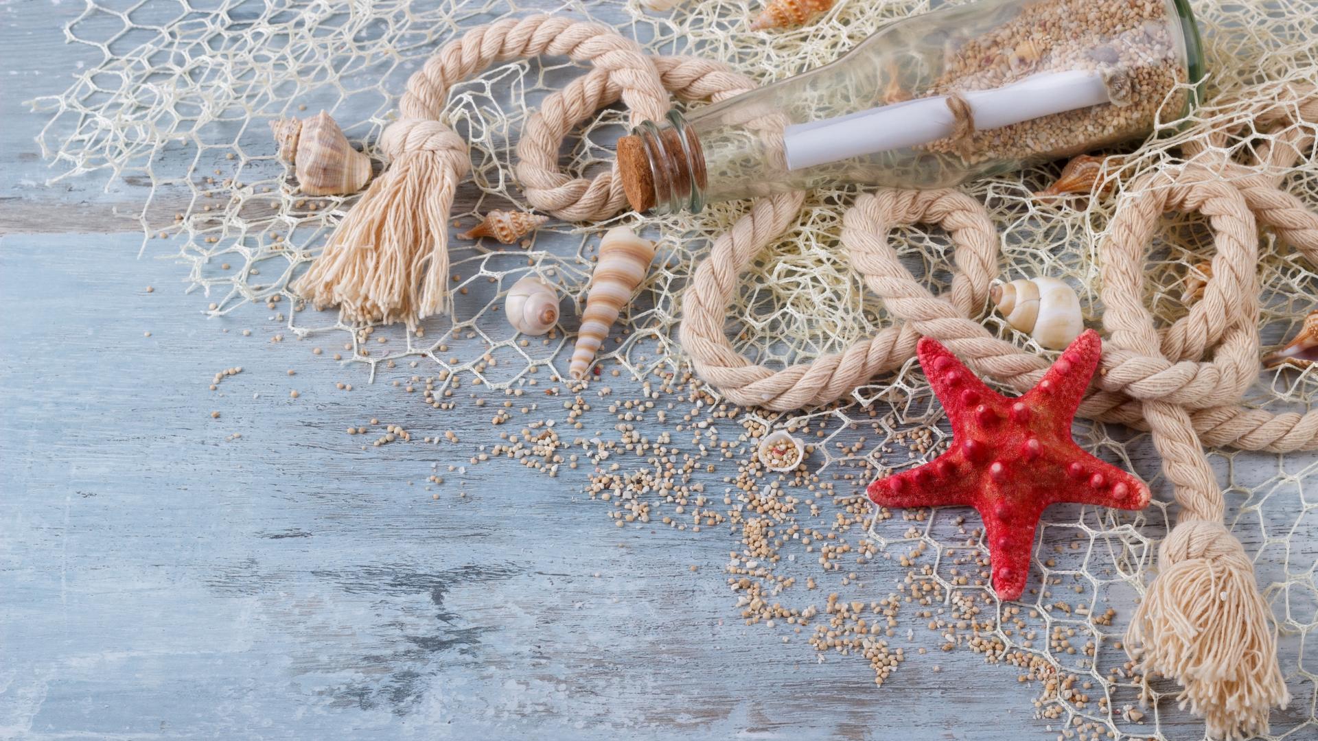 Wallpaper Bottle with a note, shells, mesh, rope and red starfish