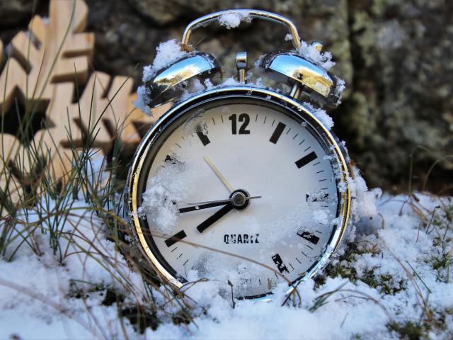 Wallpaper The alarm clock stands in the snow on the grass