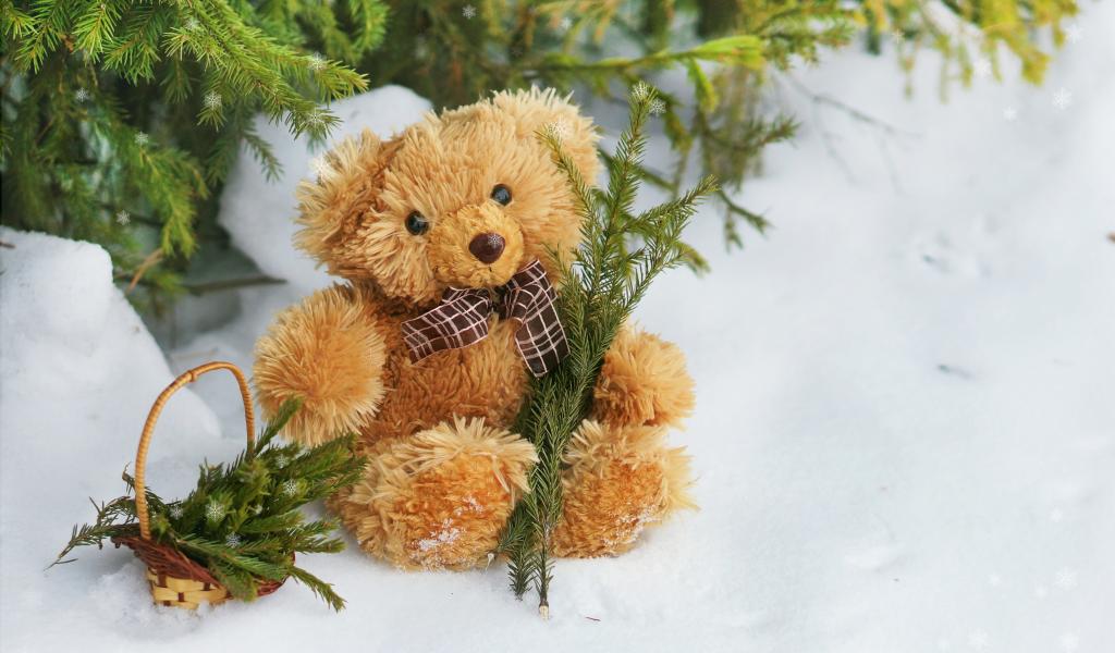 Wallpaper Teddy Bear with a branch of spruce sitting on the snow