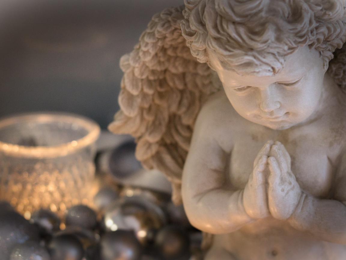 Wallpaper The figurine of an angel is lit by burning candles on a black background