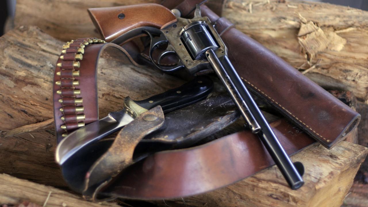 Wallpaper A revolver, a knife and bullets lie on the wood