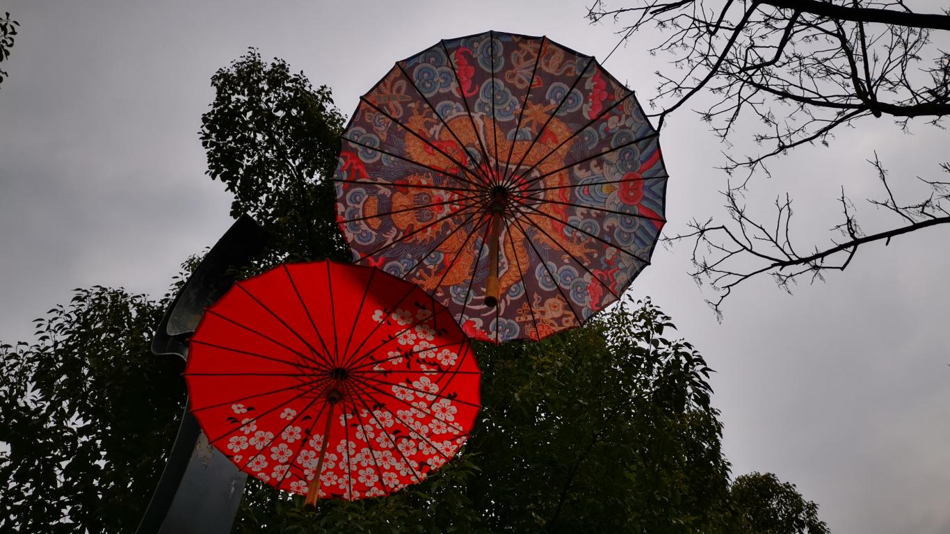 Wallpaper Two multi-colored Japanese umbrella against the sky