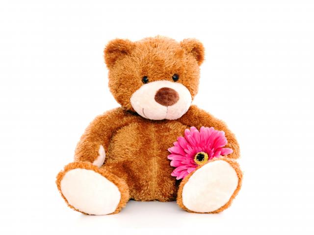Wallpaper Teddy bear with a pink gerbera flower on a white background