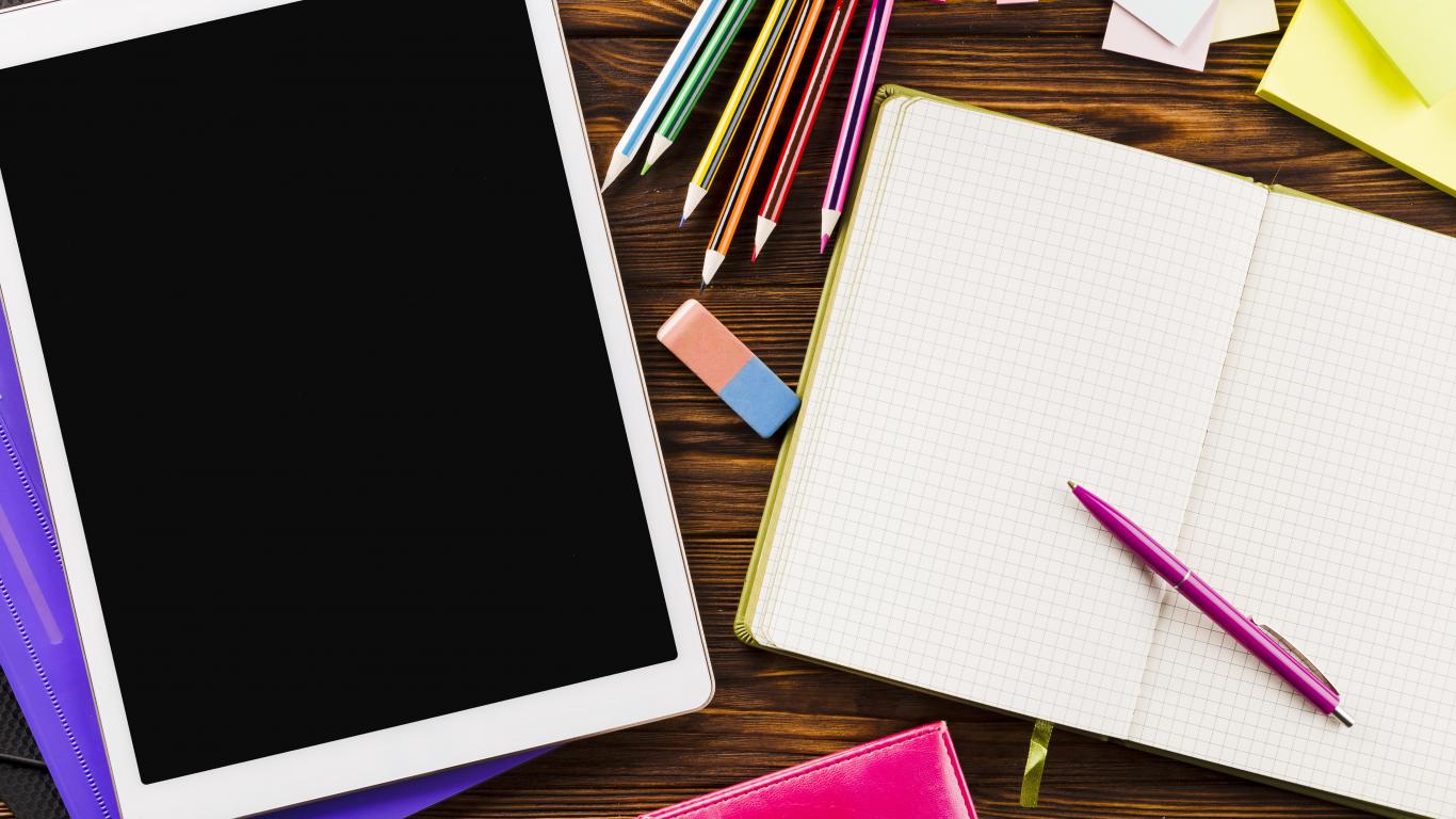 Wallpaper Tablet on the table with a notebook and pencil