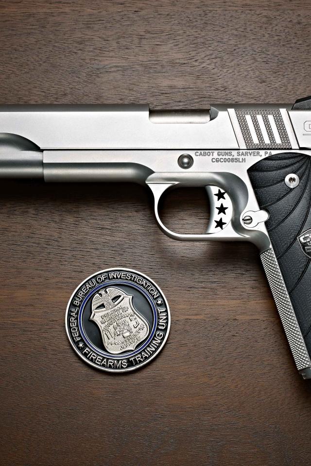Wallpaper Gun Cabot 1911 lies on a table with glasses and a badge.